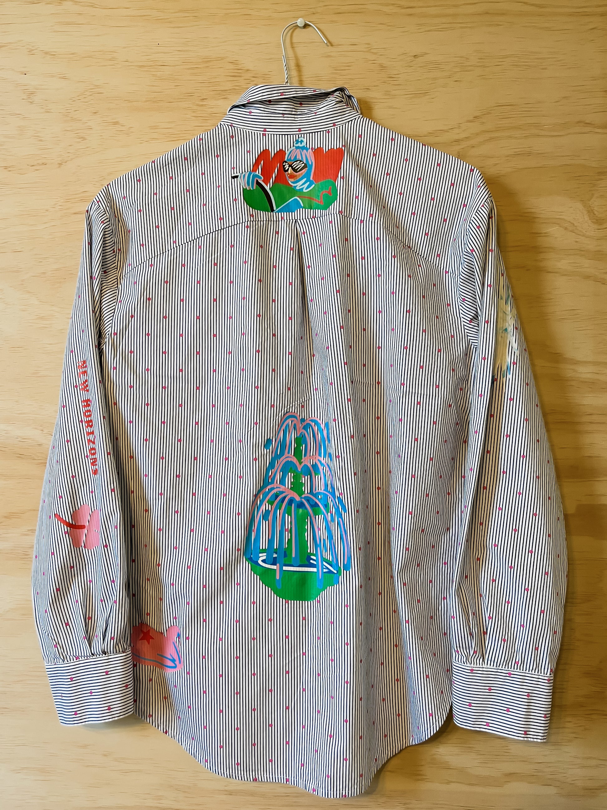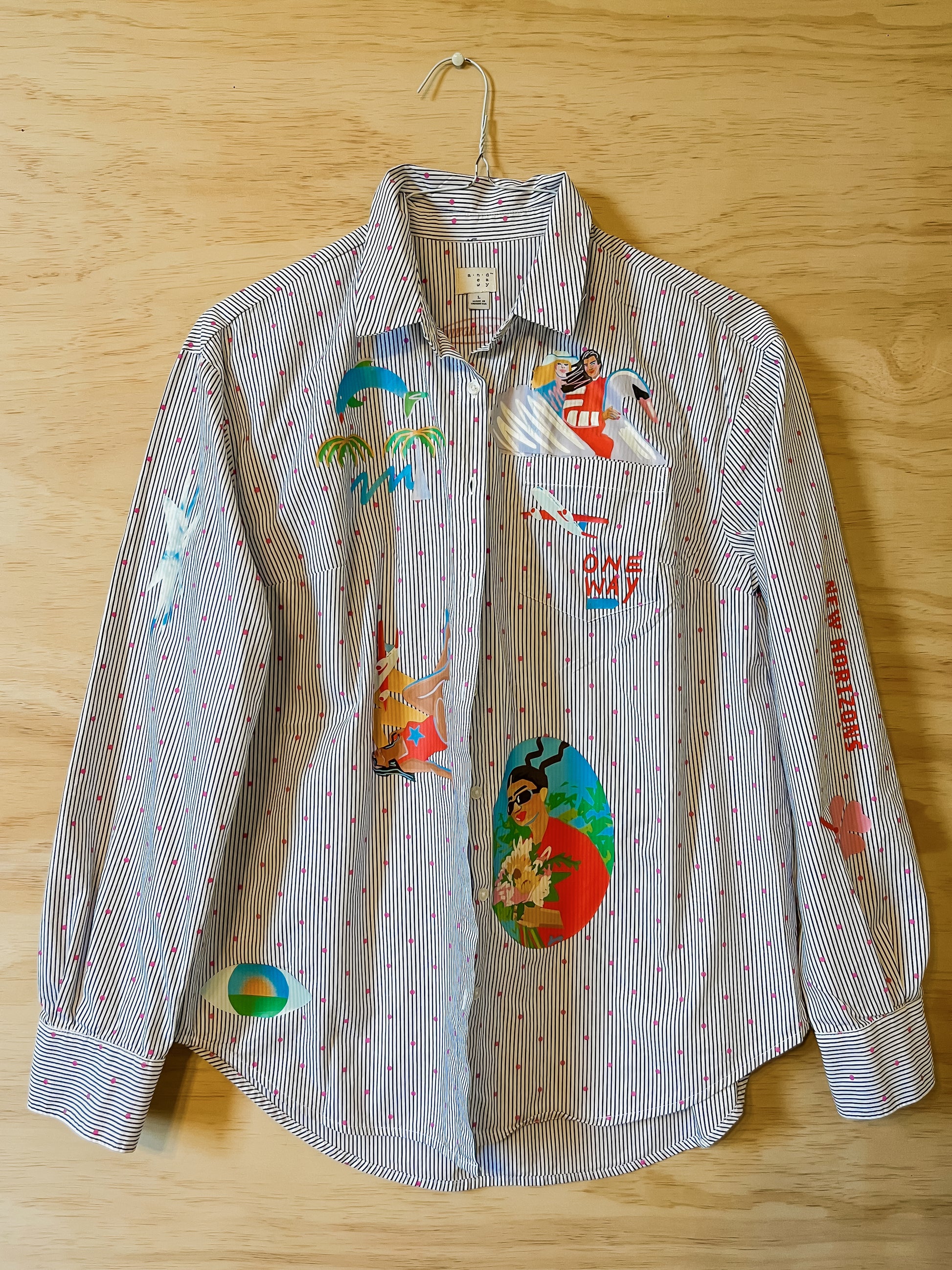 Explore New Horizons with this one of a kind upcycled shirt. Inspired by the joy of travel. All pieces are one of a kind - thrifted in New York and in Brazil and printed by me in New York
